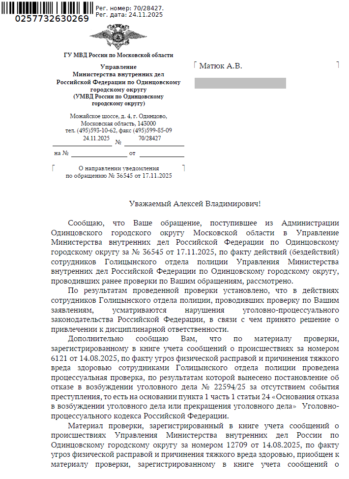 полиции (Голицынское ОП), потом втроём вместе с нападавшим стали мне