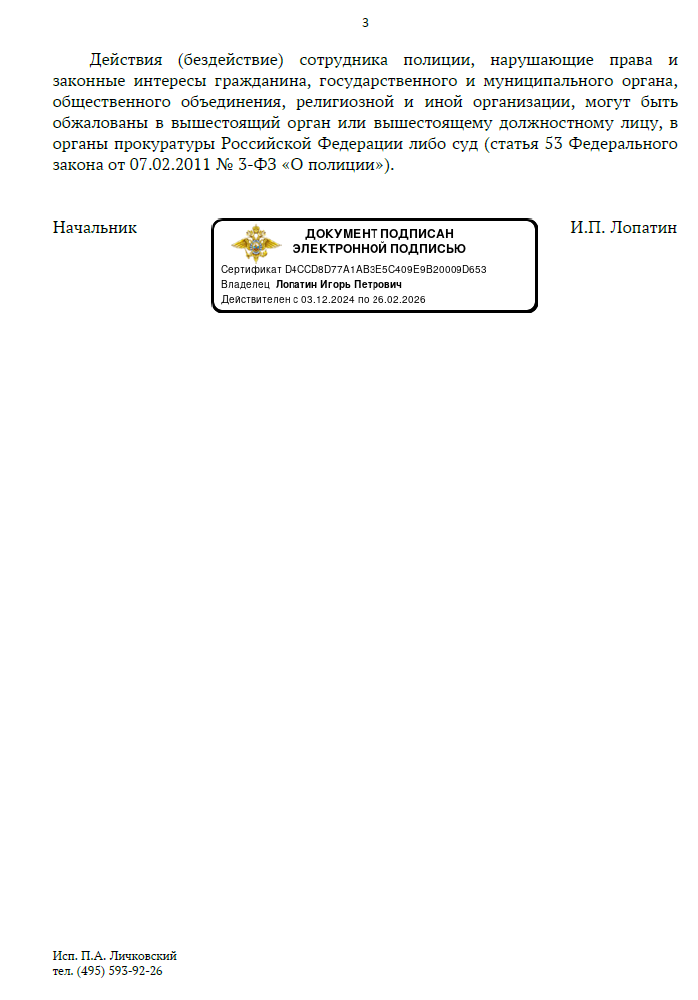 С большим трудом мне удалось "выбить" от полиции хоть какую-то логичную отписку.
